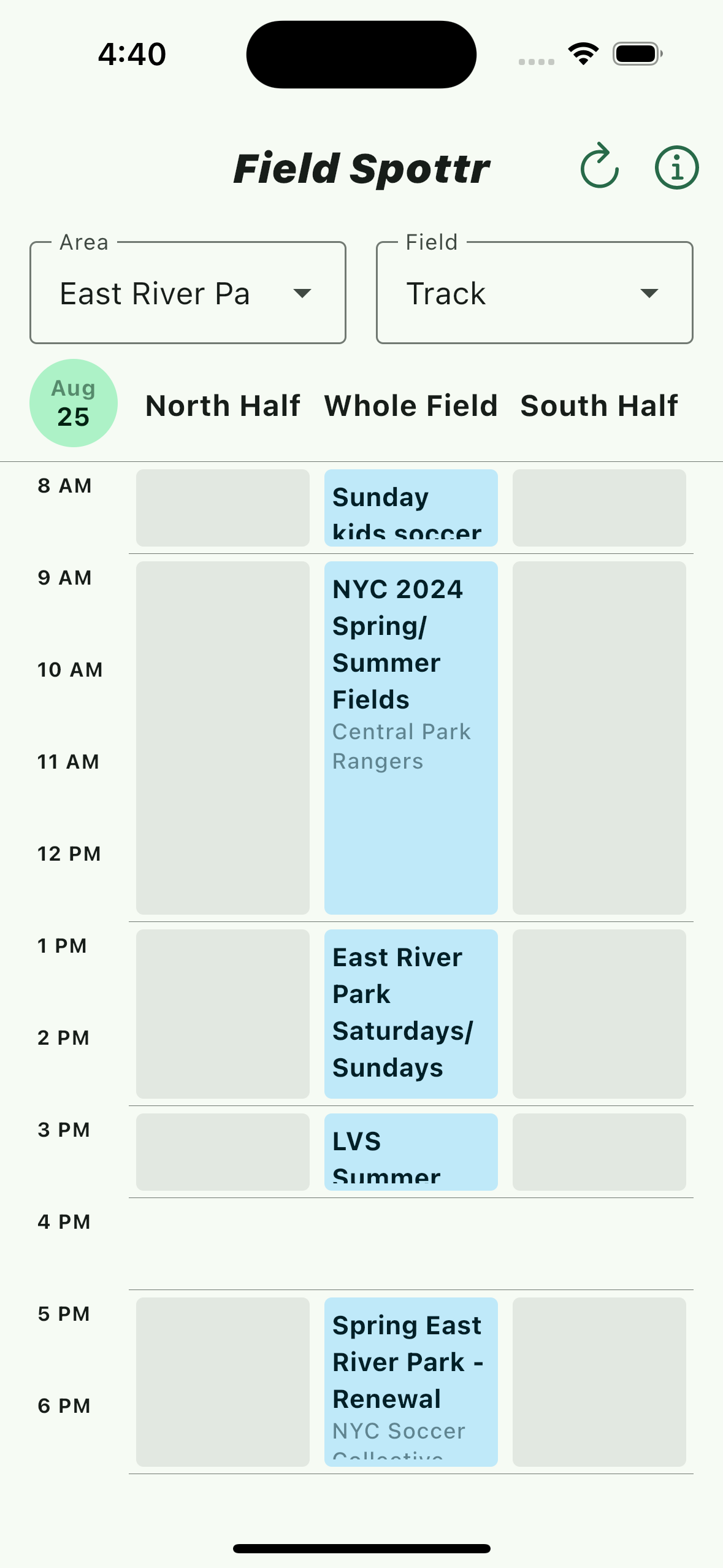 I recently wrote a little toy app for my pickup soccer group to check field permit statuses. In New York City most public parks' fields can be reserved or have recurring permits, so we have to check if fields are going to be in use before we try to organize games. The city parks website has this information, but it's a little awkward to use. They also have all permit information available in downloadable CSV files, which got me thinking I could just write my own little app. The rest of this post is notes about the process, things I used, things I learned, and hopefully some helpful references for myself and anyone else doing this in the future.